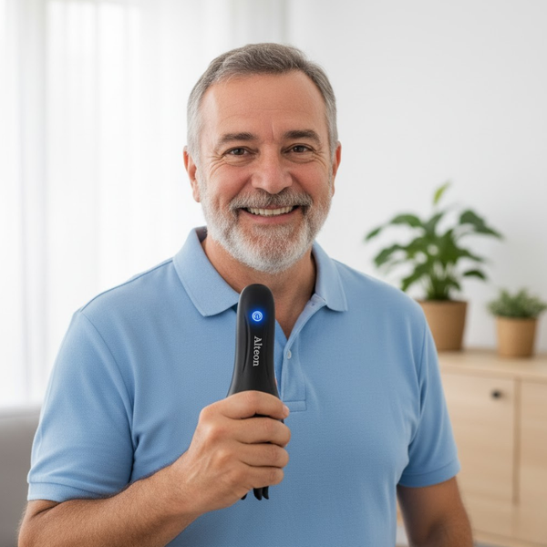 Alteon es un dispositivo compacto, inspirado en la clínica, que ofrece una terapia de ondas focalizadas para favorecer la buena circulación sanguínea, la reactividad nerviosa y la recuperación tisular. Sin medicamentos. Sin intervenciones invasivas. Solo tecnología probada, diseñada para un uso seguro, discreto y práctico en casa.
